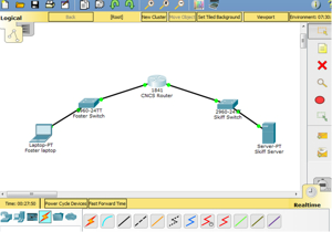 During this lab we reviewed our skills in packet tracer with the basic lab. The left is foster 192.168.3.0/24 and skiff on the right 192.168.1.0/24 with the CNCS router in the middle.