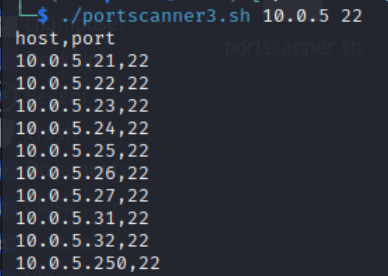 timeout .1 bash -c "echo >/dev/tcp/$ipaddr/$port" 2>/dev/null && echo "$ipaddr,$port"