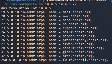 Deliverable 3. Write a script that takes a network prefix and a specific dns server in which to perform a lookup. Assume a /24 network. Provide a screenshot similar to the one below showing the program run.
