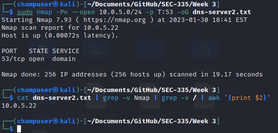 Deliverable 5. Use nmap to find your DNS servers. Figure out how to: skip host discovery, use a grepable output to send results to dns-servers2.txt, only scan for a single tcp port across 10.0.5.0/24, only report “open” ports, see if you can use a bash 1 or 2 liner to list the unique IP addresses that respond to DNS lookups.