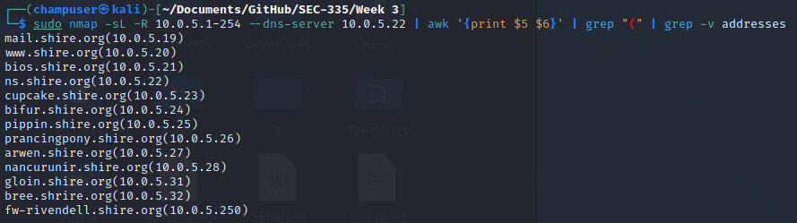 Deliverable 6. The following nmap command will use -sL (list targets) while specifying a dns server. See if you can do some magic with grep and cut or awk to produce output similar to the one below. Provide a screenshot showing your modified nmap run. Note, you may have different hosts listed as our target environment changes and grows over time.