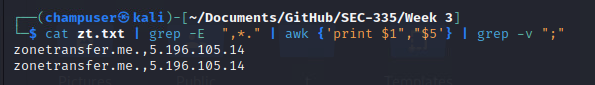 Deliverable 7. zt.txt should have some useful information, see what you can do to parse it in a manner that we have a hostname and associated ip address. Provide a screenshot similar to the one below. Note, the screenshot below is not quite perfect as not every host has an IP address.