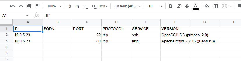 Deliverable 4. Provide a screenshot similar to the one below that shows your exported googlesheet of nmap scan data against cupcake. Note, the scan in the demo did not show version detection. See if you can figure out how to do that. You will have at least two ports.