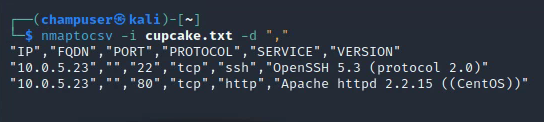 nmaptocsv -i cupcake.txt -d ","