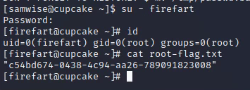 Deliverable 10. Provide a screenshot that shows the results of the id command as well as the contents of root-flag.txt similar to the one below.