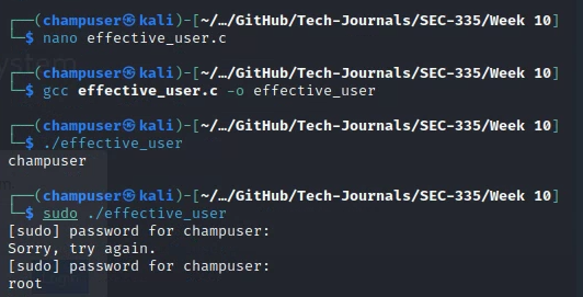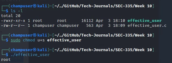 }Deliverable 1. Using the code above, create a file called effective user.c and compile and execute the file as a normal user and using sudo. Provide a screenshot similar to the one below.