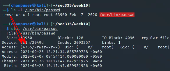 Deliverable 2. What are the octal (numeric) permissions of the effective user program? Using ls -l you should be able to calculate these permissions, you can also use the “stat” program as a shortcut. Remember r=4,w=2, x=1, and ”-” is a 0