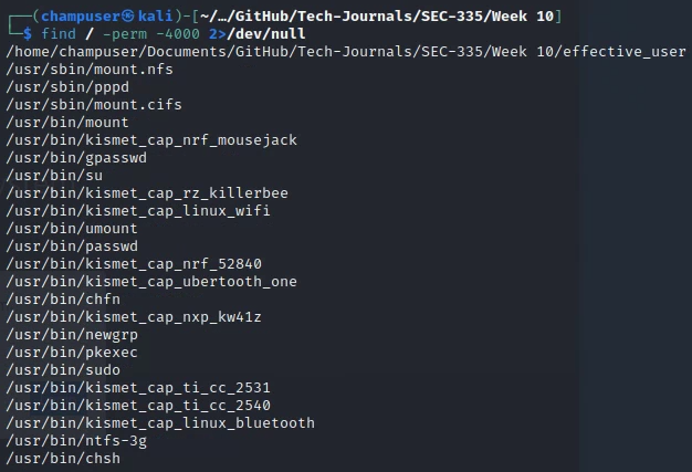 Deliverable 4. Hit the internet and find a means to search for suid programs across your kali system. Do so as a normal user as this is a privilege escalation technique you might use. Make sure to document this. You will need to deal with permissions errors by piping those to /dev/null. Provide a screenshot showing your command and listing similar to that below. Your own sudo program should be in the list.