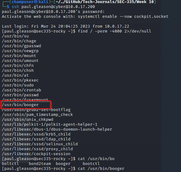 Deliverable 5. A suid program has been hidden on rocky (10.0.17.200). Please hunt it down. Provide a screenshot that shows the command and file found. It will be obvious and the name will start with a ‘b’.