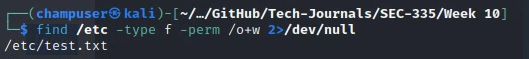 Deliverable 6. Consider the following screenshot. This user created a file under /etc/ that is world writable. Were this file to be of any security relevance, this could be a problem. Create such a file, and figure out how to find it. Show your command.