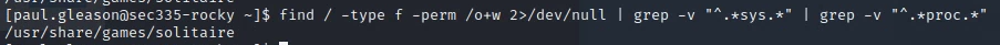 Deliverable 7. A world writable file has been hidden on rocky. Please hunt it down. Provide a screenshot that shows the command and file found. It will start with an ‘s’. (note, the sys and proc directories will give you a lot of false positives)