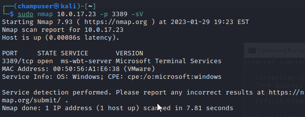 sudo nmap 10.0.17.23 -p 3389Deliverable 3. On Kali, make sure remmina is installed and figure out how to initiate an RDP session to your windows box. Provide a screenshot similar to the one below.
