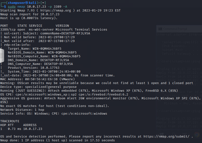 sudo nmap 10.0.17.23 -p 3389 -sVDeliverable 5. Replace -sV with -A to attempt to derive more information on the host and exposed service. Provide a screenshot similar to the one below. You will notice that the rdp-ntlm-info script provides a good deal of information (1) and that the OS detection output is not very accurate at all.
