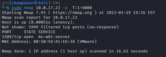 sudo nmap 10.0.17.23 -p 3389 -ADeliverable 6. Run an nmap scan against your windows 10 system. Only target tcp ports 1-6000. Provide a screenshot showing your command and output.