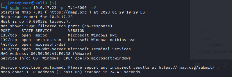 sudo nmap 10.0.17.23 -p T:1-6000Deliverable 8. Figure out how to run a version scan against only the ports exposed above. Provide a screenshot showing your nmap command and the output similar to the one below.
