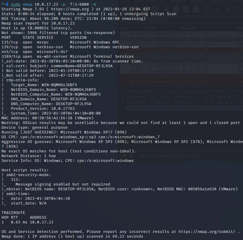 sudo nmap 10.0.17.23 -p T:1-6000 -sVDeliverable 9. Increase the output by running OS Detection, Version Detection, Script Scanning and traceroute against your windows 10 target. Provide a screenshot showing your command and output similar to the one below. You will notice we have smb and netbios related information.