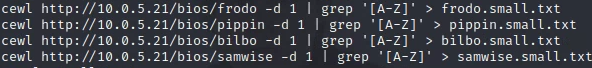 cewl http://10.0.5.21/bios/frodo -d 1 | grep '[A-Z]' > frodo.small.txt
