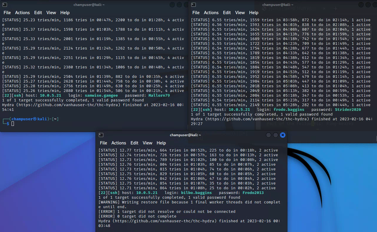 Deliverable 6. Submit screenshots of your tool of choice reporting successful ssh password guesses of at least 3 member’s linux accounts.