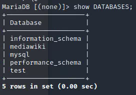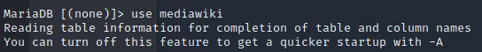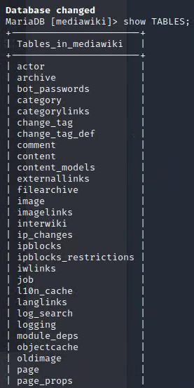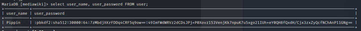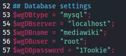 I found there is a user called peregrin.took as well there is an sql user. This means I could try to get into peregrin.took or try to use some of the default mysql logins. As well I was looking at CVE’s for mediawiki and it seems passwords/login information is stored in LocalSettings.php