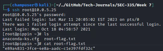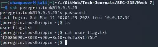 Deliverable 7. You should be able to get into pippin as an authorized user. Provide a screenshot showing your session and cat the user-flag.