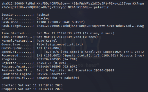 hashcat -m 12100 modifiedpippinhash.txt -w 4 -a 0 pippinwordlist.txt