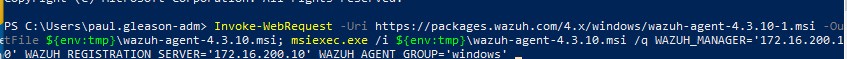 msiexec.exe /i ${env:tmp}\wazuh-agent-4.3.10.msi /q WAZUH_MANAGER='172.16.200.10' WAZUH_REGISTRATION_SERVER='172.16.200.10' WAZUH_AGENT_GROUP='windows'