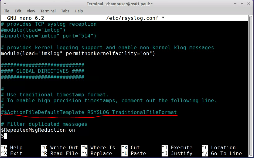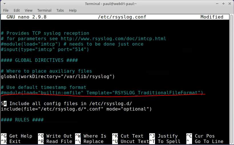 Edit the rsyslog.conf file sudo nano /etc/rsyslog.conf