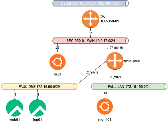 During this lab we setup mgtm01 and setup the fw to allow connection to the 172.16.150.0/24 network. Then setup chrome remote desktop on mgmt01, ssh key authnetication from mgmt01 to log01. Then setup authpriv messages for rsyslog from web01 and vyos.