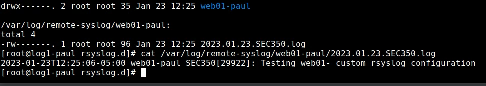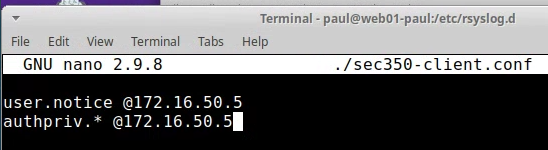 sudo nano /etc/rsyslog.d/sec350-client.conf- Add this line (IP is log machine)
