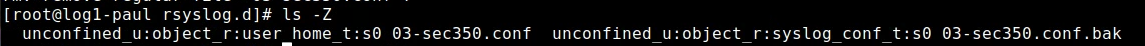 SE linux got me once again… I had scp’d to the user home dir the 03-sec250.conf file to log1 and then mv’d it to /etc/rsyslog.d/. This made it so the file had kept the user_home_t tag seen below