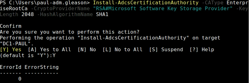 Install-AdcsCertificationAuthority -CAType EnterpriseRootCa -CryptoProviderName "RSA#Microsoft Software Key Storage Provider" -KeyLength 2048 -HashAlgorithmName SHA1