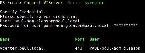 Or connect with domain user ($vcenter=”vcenter.paul.local”)