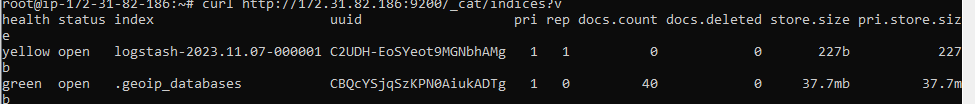 curl http://<Private IP>:9200/_cat/indices?v