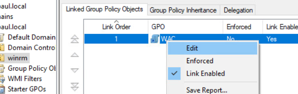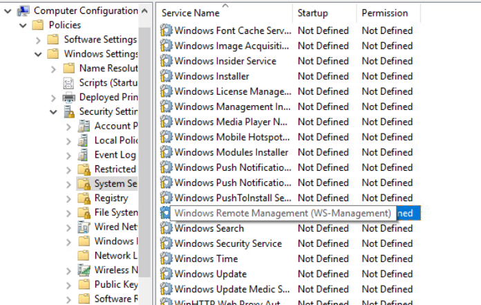 The modify Computer Configuration > Policies > Windows Settings > Security Settings > System Services and selected Windows Remote Management