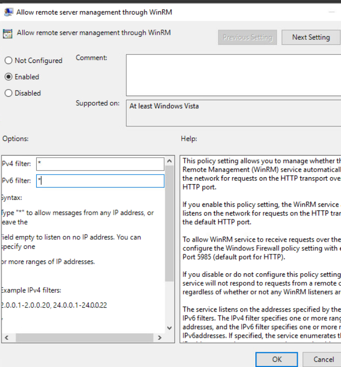 Then go to Computer Configuration > Policies > Administrative Templates > Windows Components > Windows Remote Management > WinRM Service then select Allow remote server management through WinRM and set to Enabled and * for filters