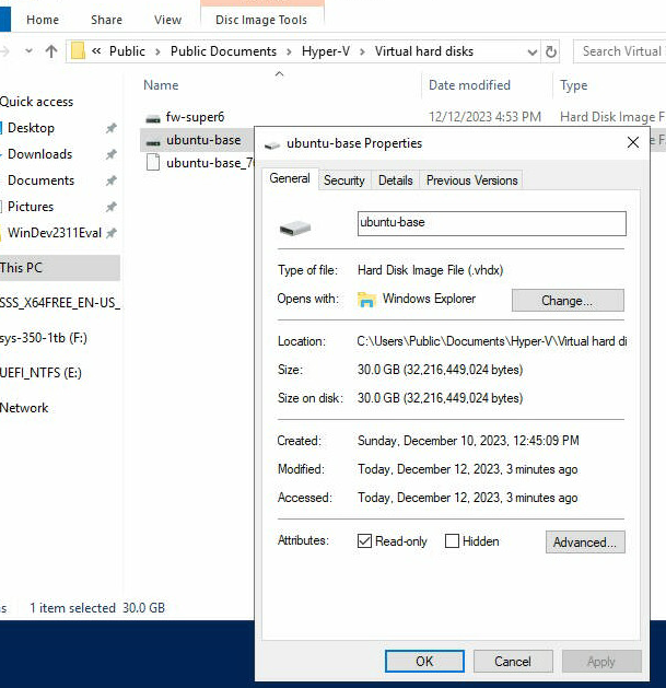 Deliverable 1. Hunt down the VHD file associated with your Ubuntu Base Image and give that file read only permissions. Provide a screenshot similar to the one below.