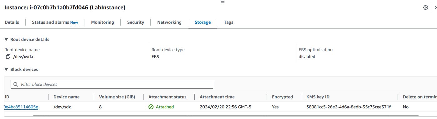 Task 6: Screenshot of Instance - Storage Tab showing the volume is encrypted with a KMS key