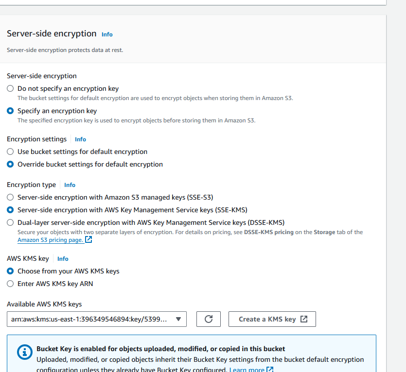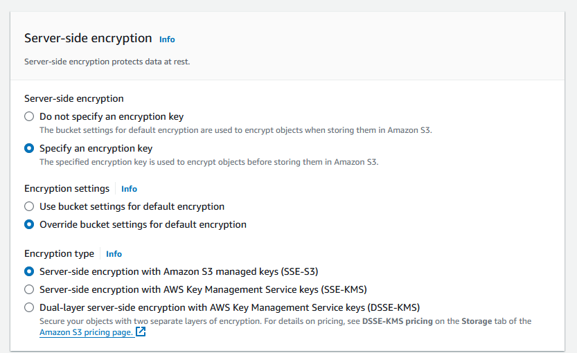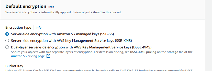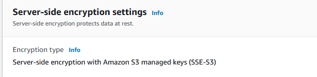 - Select SSE-S3 (this uses AWS’s managed key)