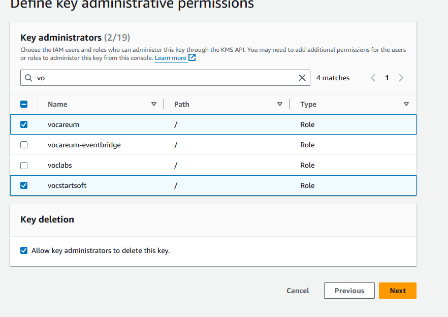 On the “Key Administrative” page - you need to add the “vocareum” and “vocstartsoft” roles - which are on the second page of listed roles