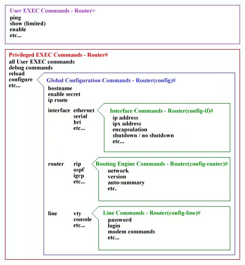 | Router(config)# | Configuration mode (notice the # sign indicates this is accessible only at privileged EXEC mode) |